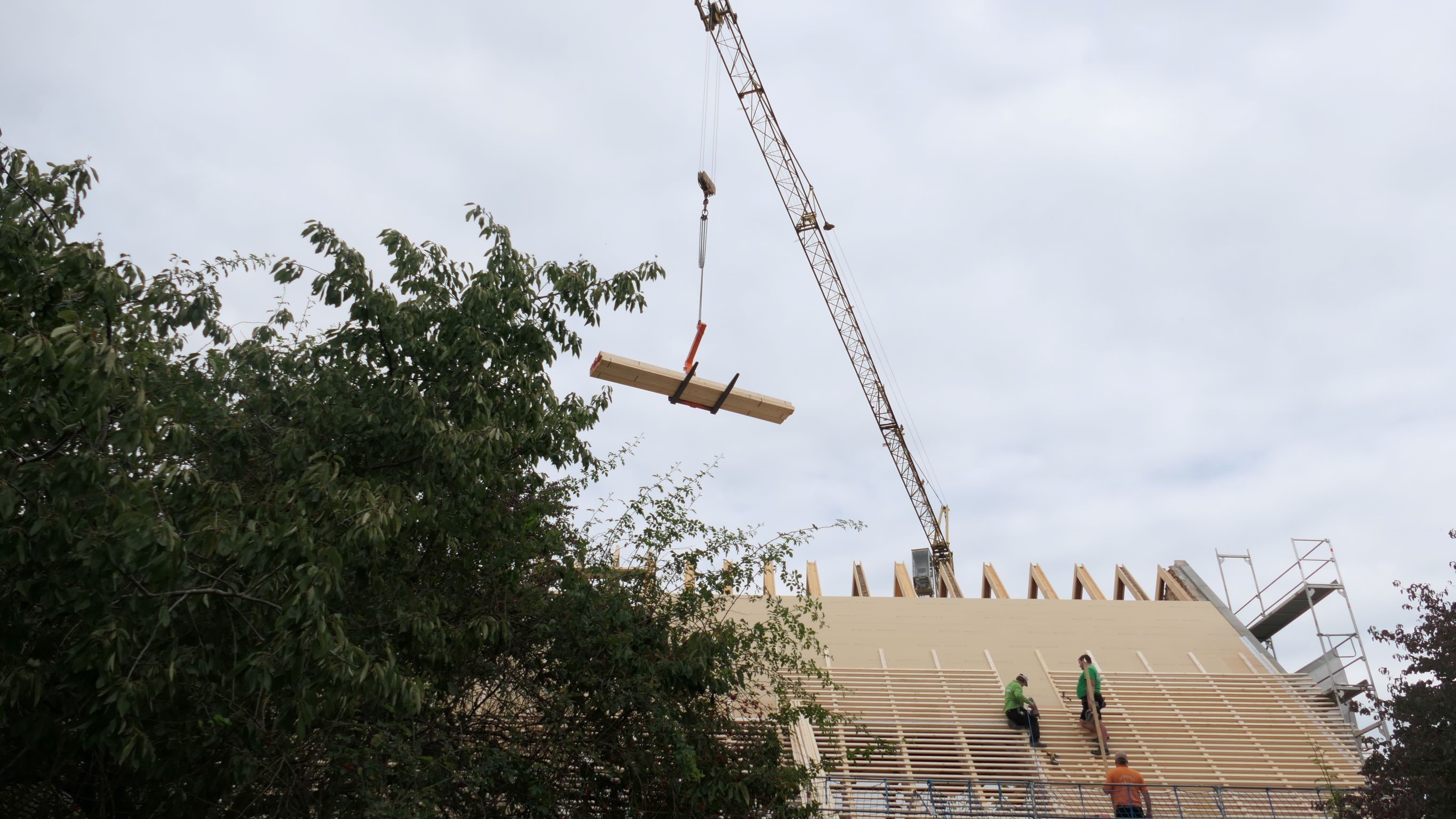 eingehaust, aber das obere Dach nicht. Dort arbeiten sie und