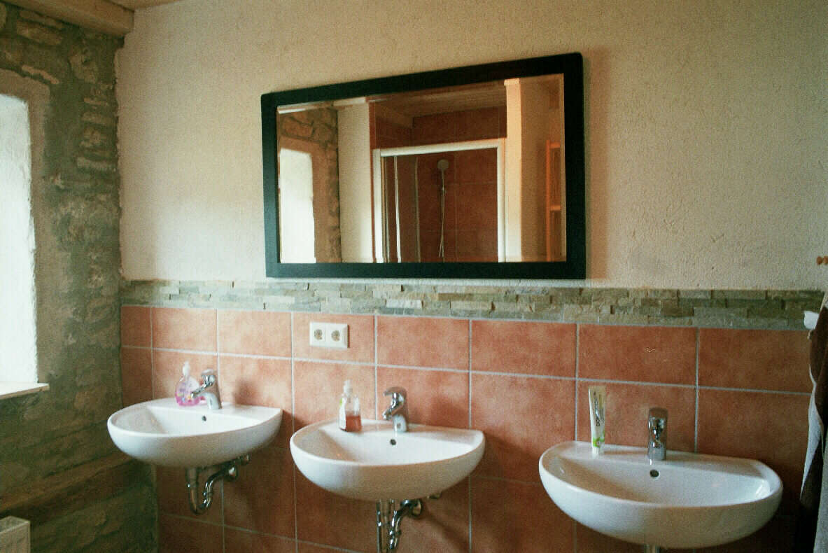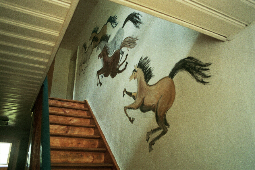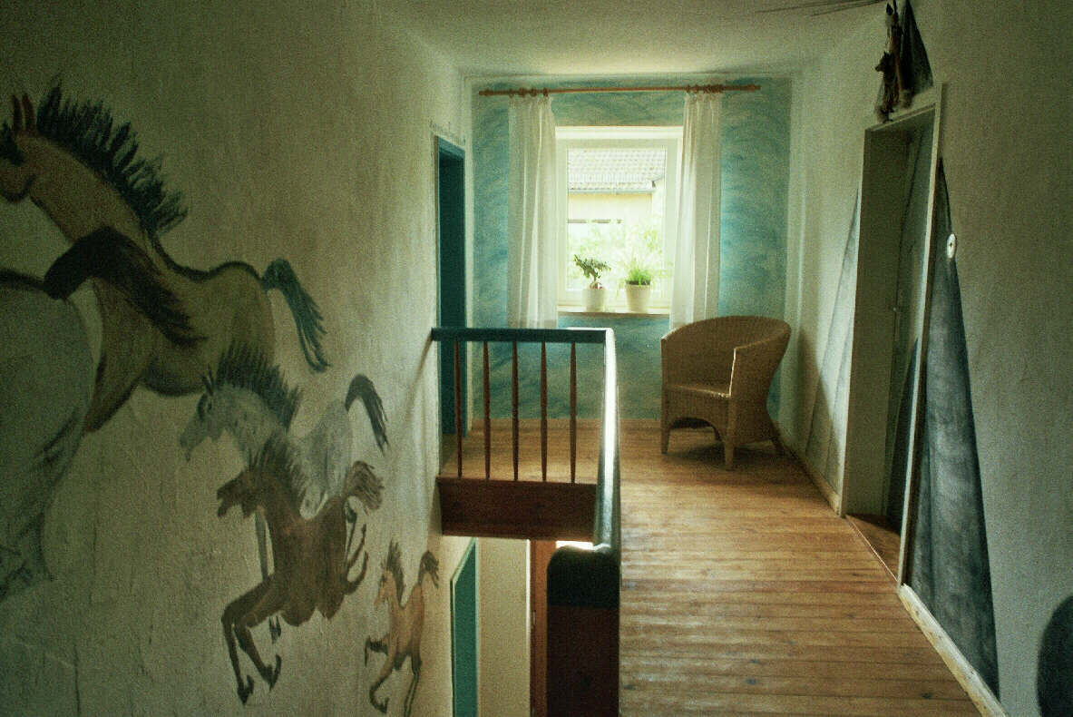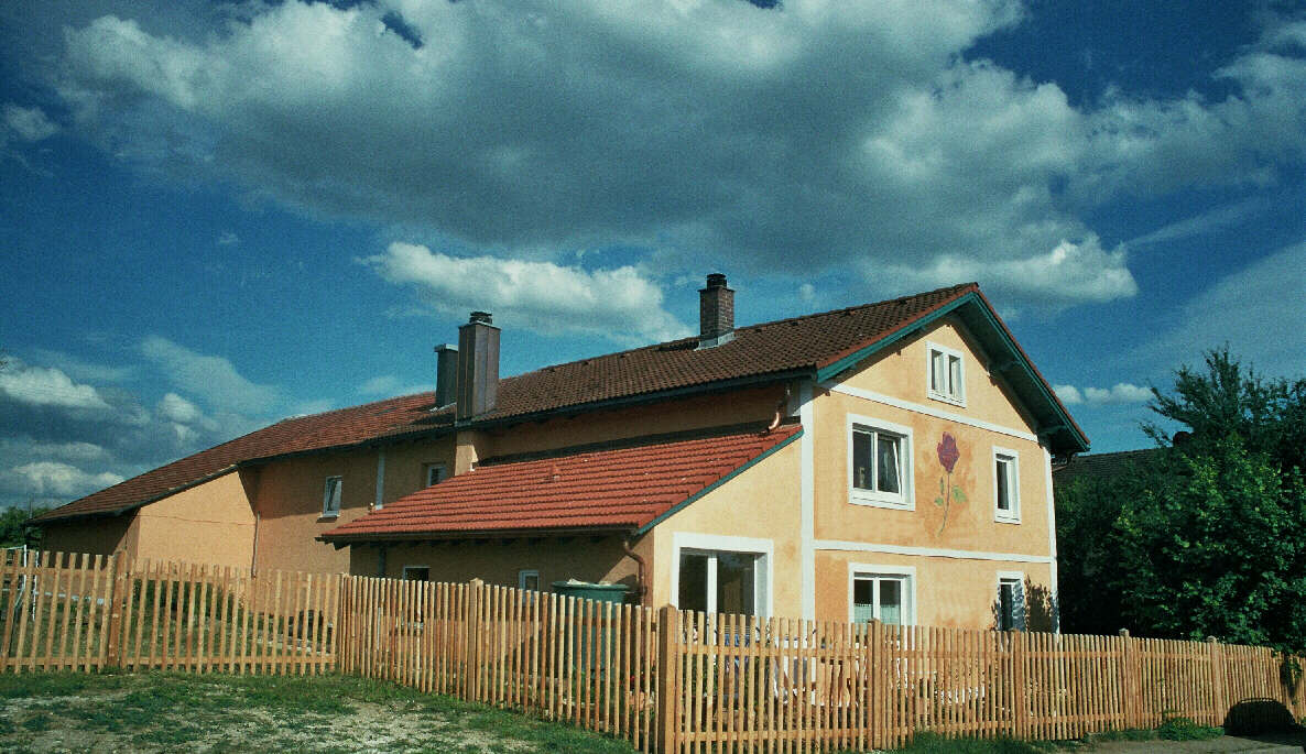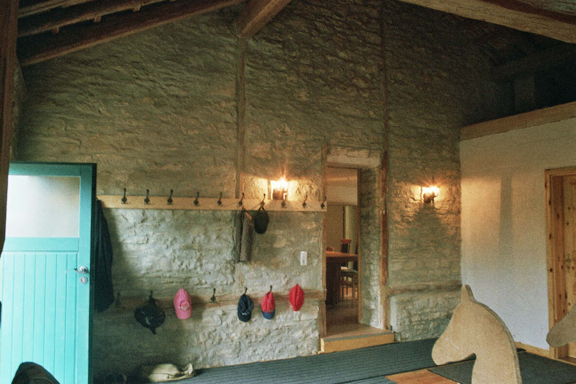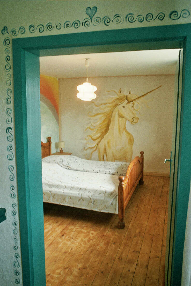 Eine Brandwand zum Stallteil hin ermöglichte den Einbau eines Matratzenlagers und eines neuen Bades für Reit- und Feriengäste. Der typische Jurahausdachstuhl blieb original erhalten. Die Gästezimmer wurden wunderschön neu gestaltet und zur Freude vieler Gastkinder als Indianerzimmer, Pippi-Langstrumpfzimmer und poetisches Einhornzimmer von einer Freundin der Bauherrin fantasievoll gestaltet. Eine neue, nun wieder zum Haus passende Eingangstüre rundet das Gesamtkonzept ab. |