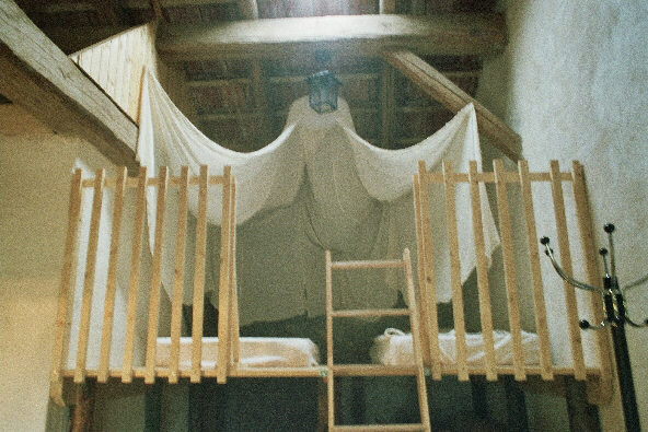 sog. "Matratzenlager im ehemalgen Heuboden. Die alte Mauer