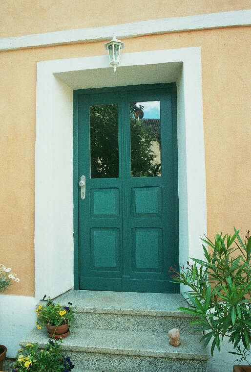 Das Gebäude: Ist ein schönes, altes Jurahaus, dessen Befensterung leider im Lauf der 70-iger Jahre "zeitgemäss" geändert worden war. Das war jedoch die einzige Veränderung, zusammen mit einer Eternitverkleidung des Giebels. Die Befensterung musste aus Kostengründen bleiben, (die frühere Eigentümerin hatte vor kurzem erst neue Kunststoff-fenster einbauen lassen) aber die Fassade wurde mit einem Kalkfreskoputz versehen, und eine für Jurahäuser typische Putzgliederung mit Lisenen, Faschen und Putzbändern wieder hergestellt.