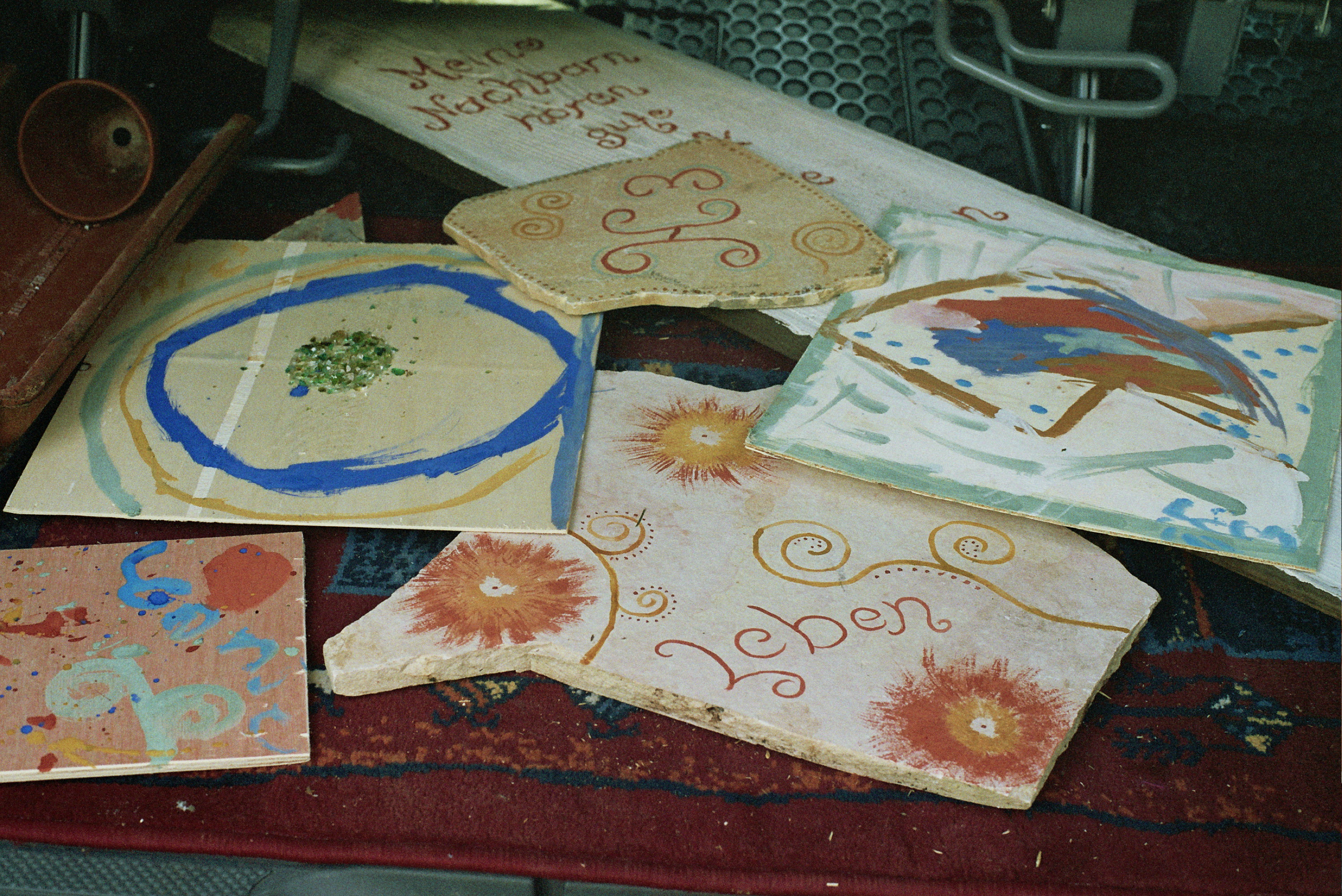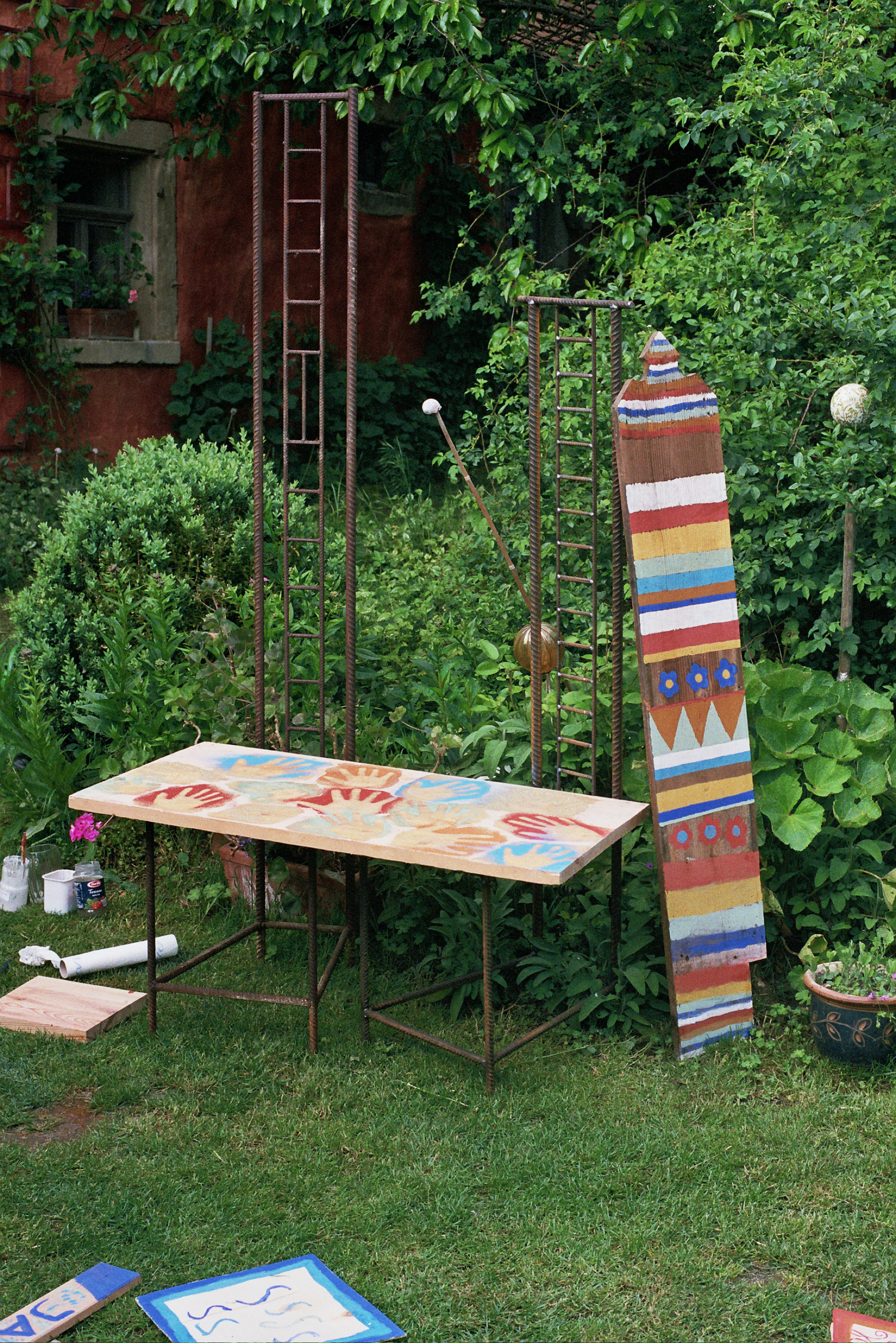 Gästebilder und Tauschgeschäfte: Diese Bilder hier sind Kunstwerke von Gästen, die bei mir ein Seminar "Malen mit Naturfarben" gebucht haben - mein Lohn dafür waren die beiden Eisernen Stühle, die vor dem Haus stehen. Es