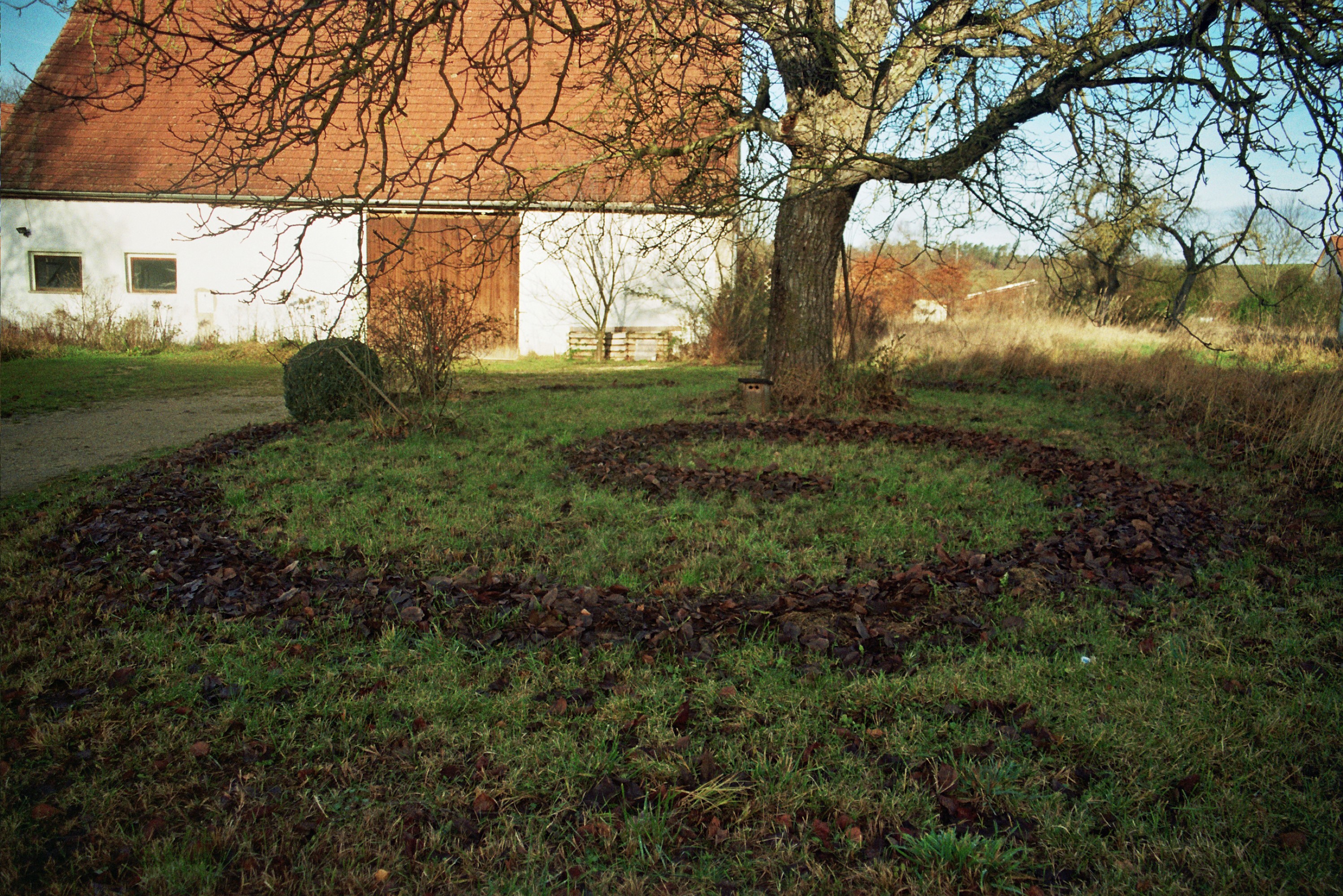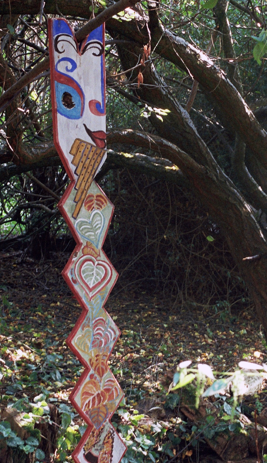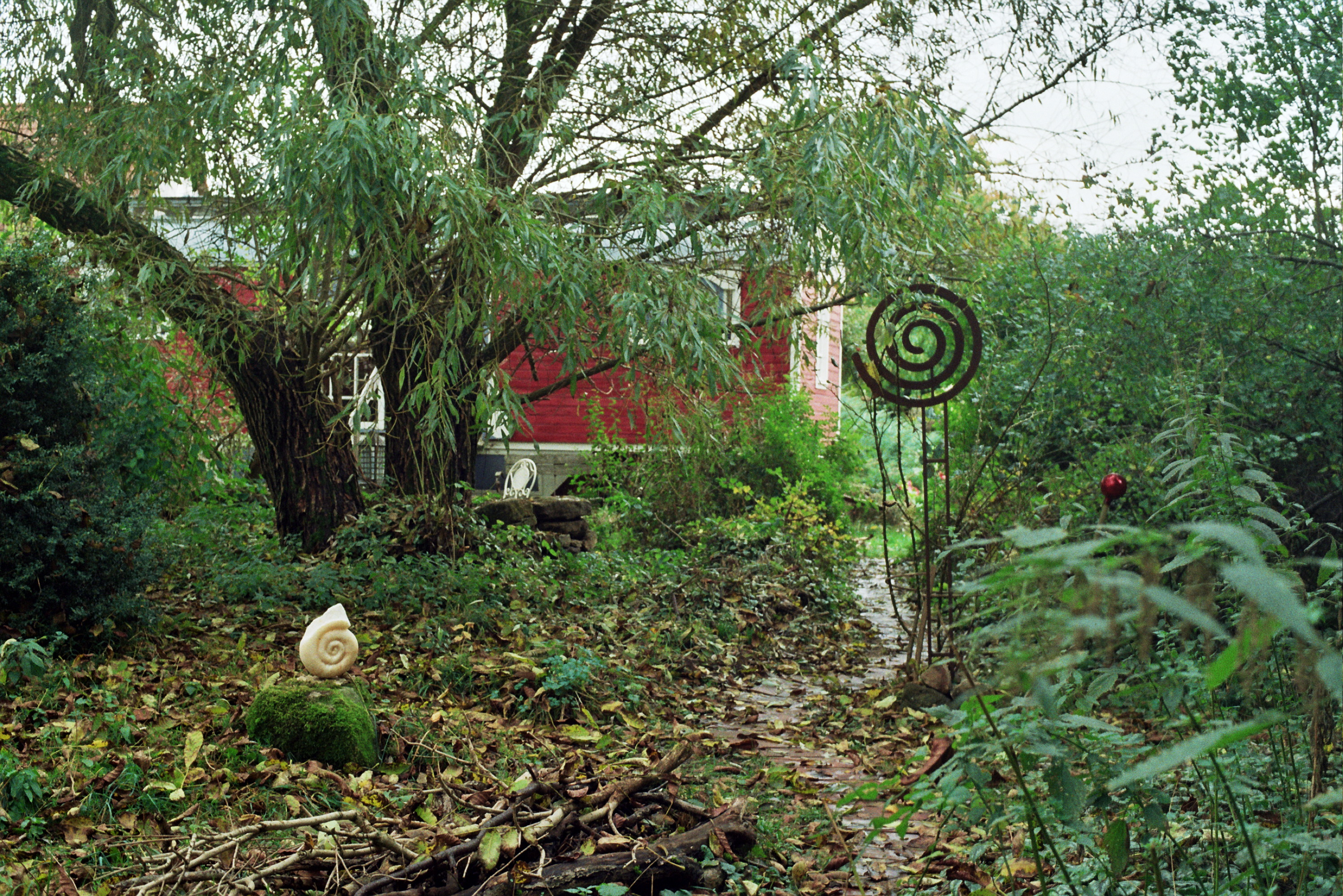 Pan ist etwas verblasst. nicht mehr so bunt wie auf dem Bild, aber er spielt nach wie vor auf seiner Flöte unter dem Kirschbaum. Manchmal findet man alle möglichen Arten von Spiralen, die Laubspirale ist vor dem Parkplatz unter dem Walnussbaum.