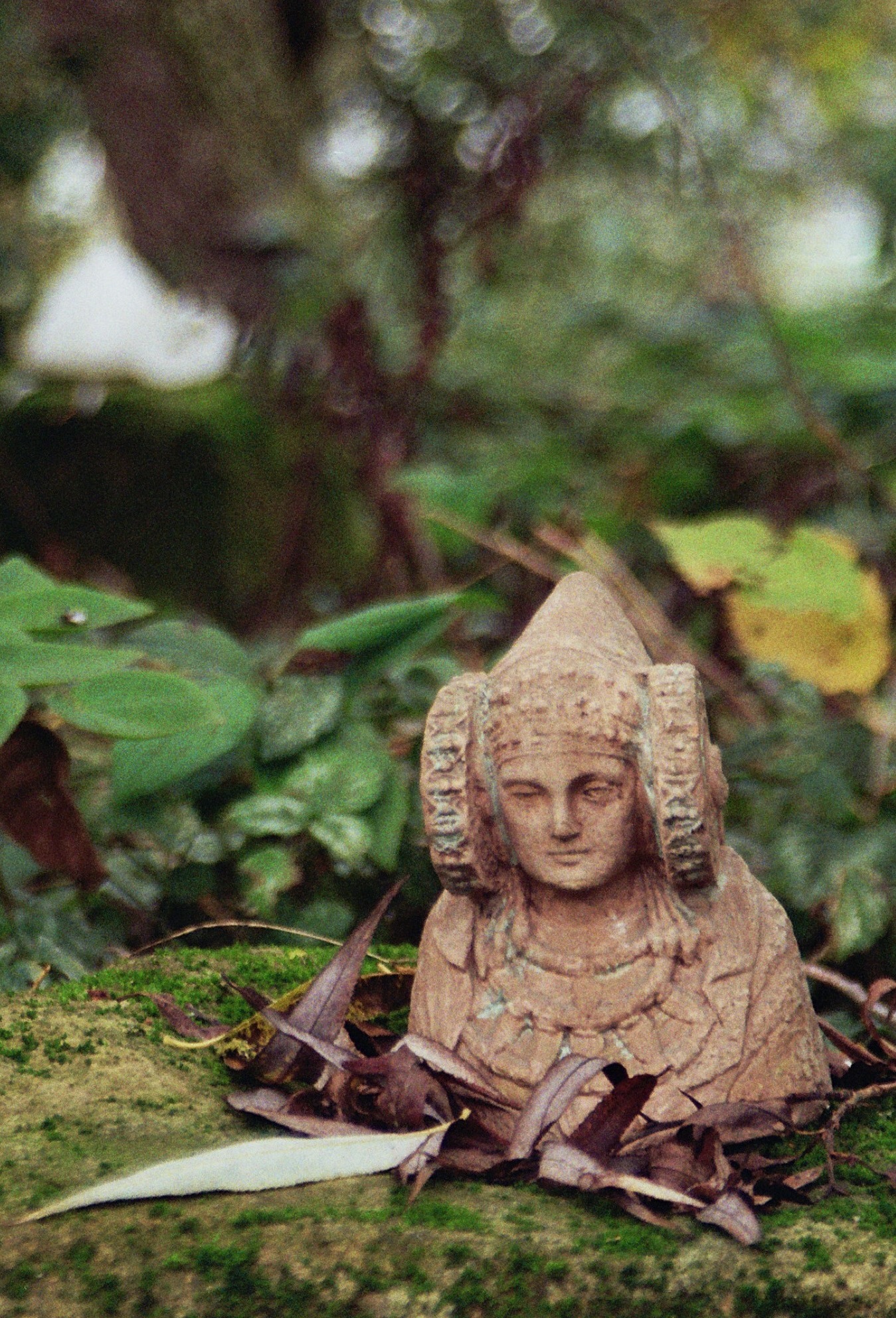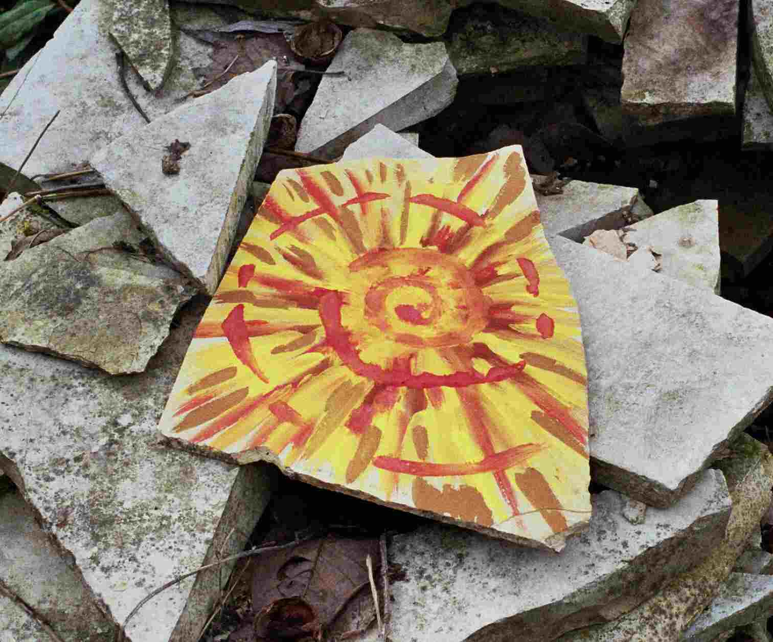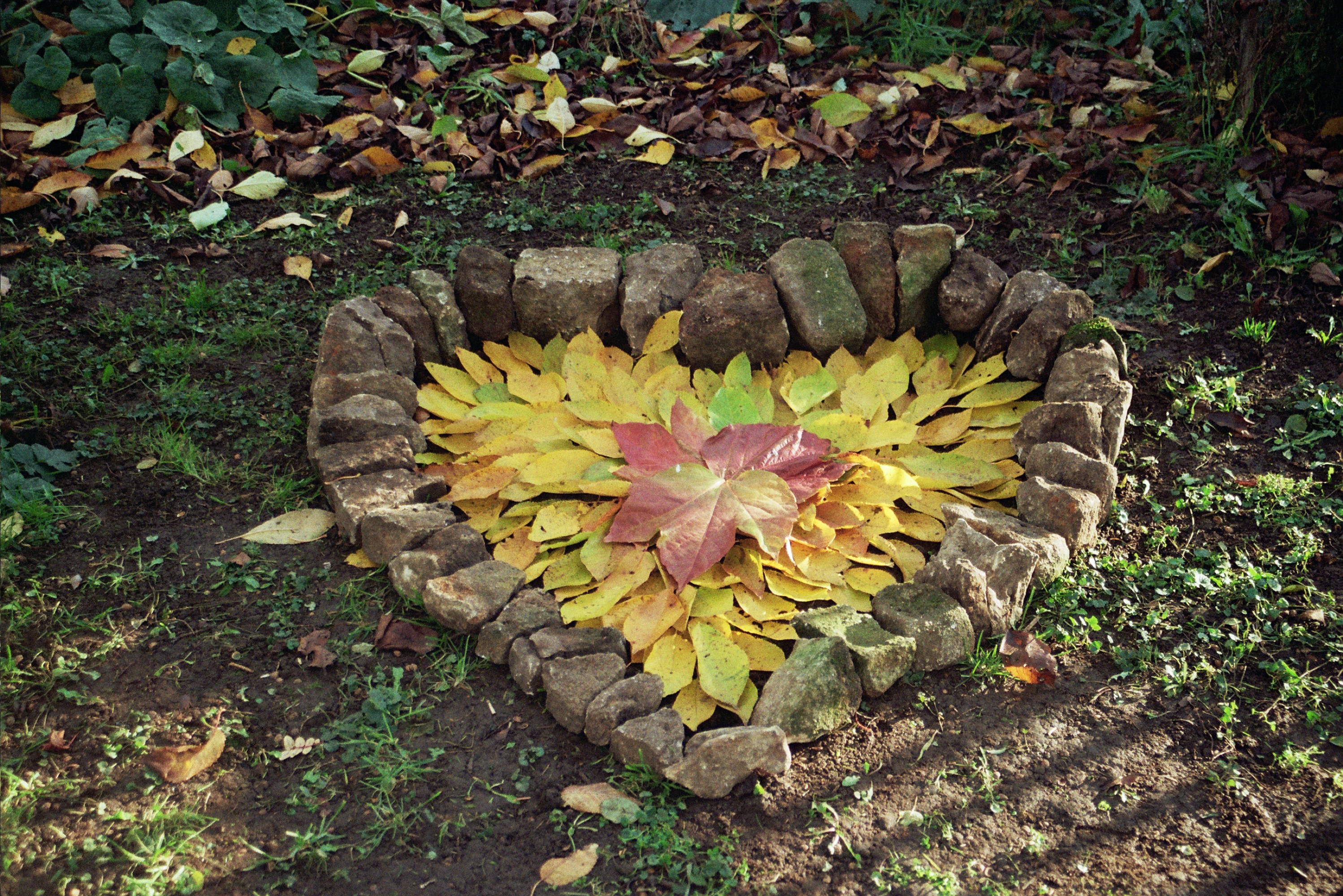 Pan ist etwas verblasst. nicht mehr so bunt wie auf dem Bild, aber er spielt nach wie vor auf seiner Flöte unter dem Kirschbaum. Manchmal findet man alle möglichen Arten von Spiralen, die Laubspirale ist vor dem Parkplatz unter dem Walnussbaum.