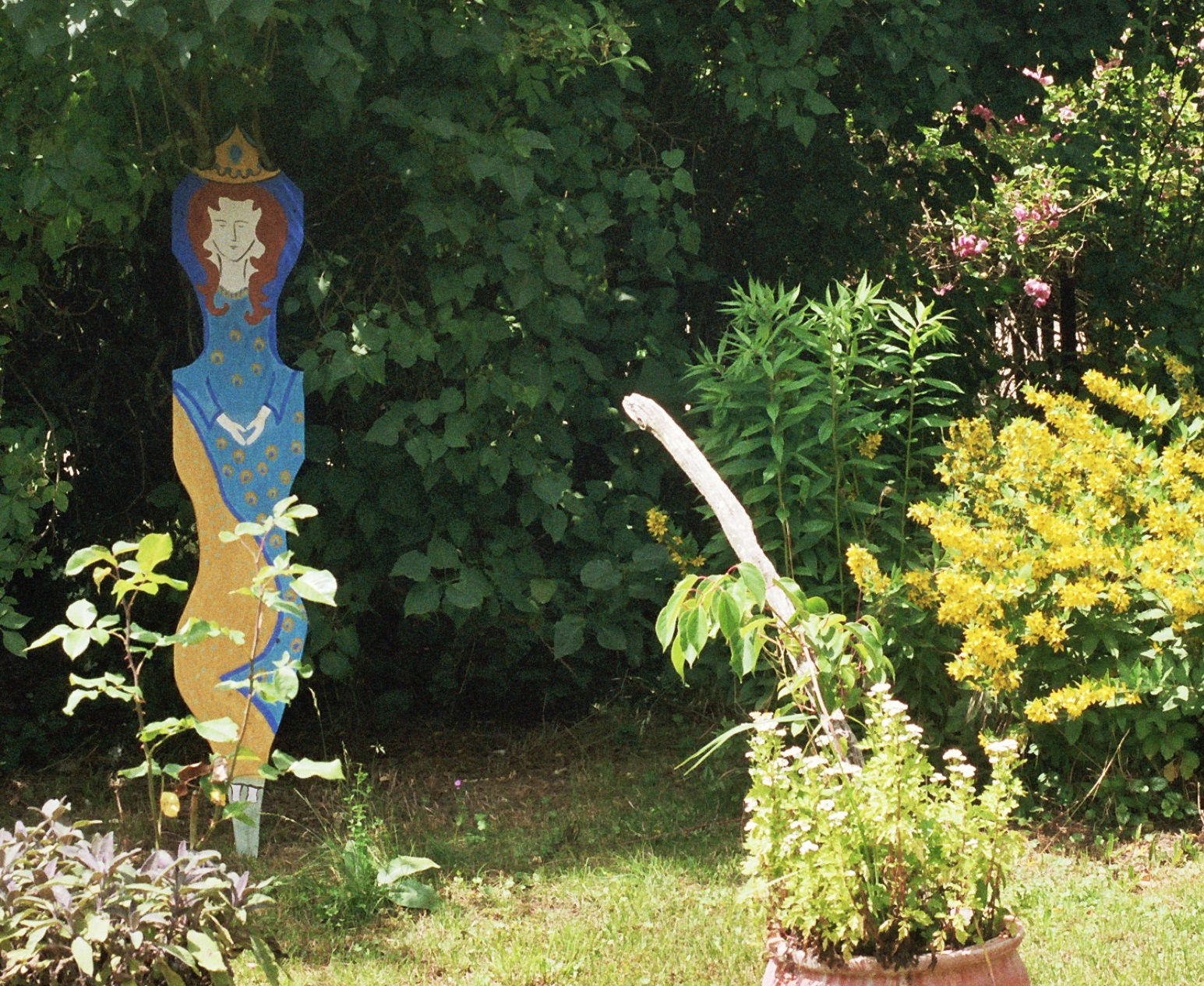 Ein altes Brett wird zu Frau Holle., die manchmal im Sommer unter dem Holunderbusch am Hofeingang steht. |