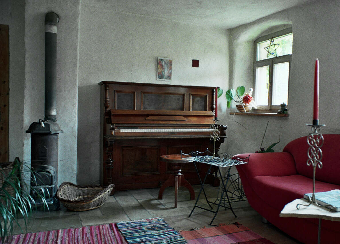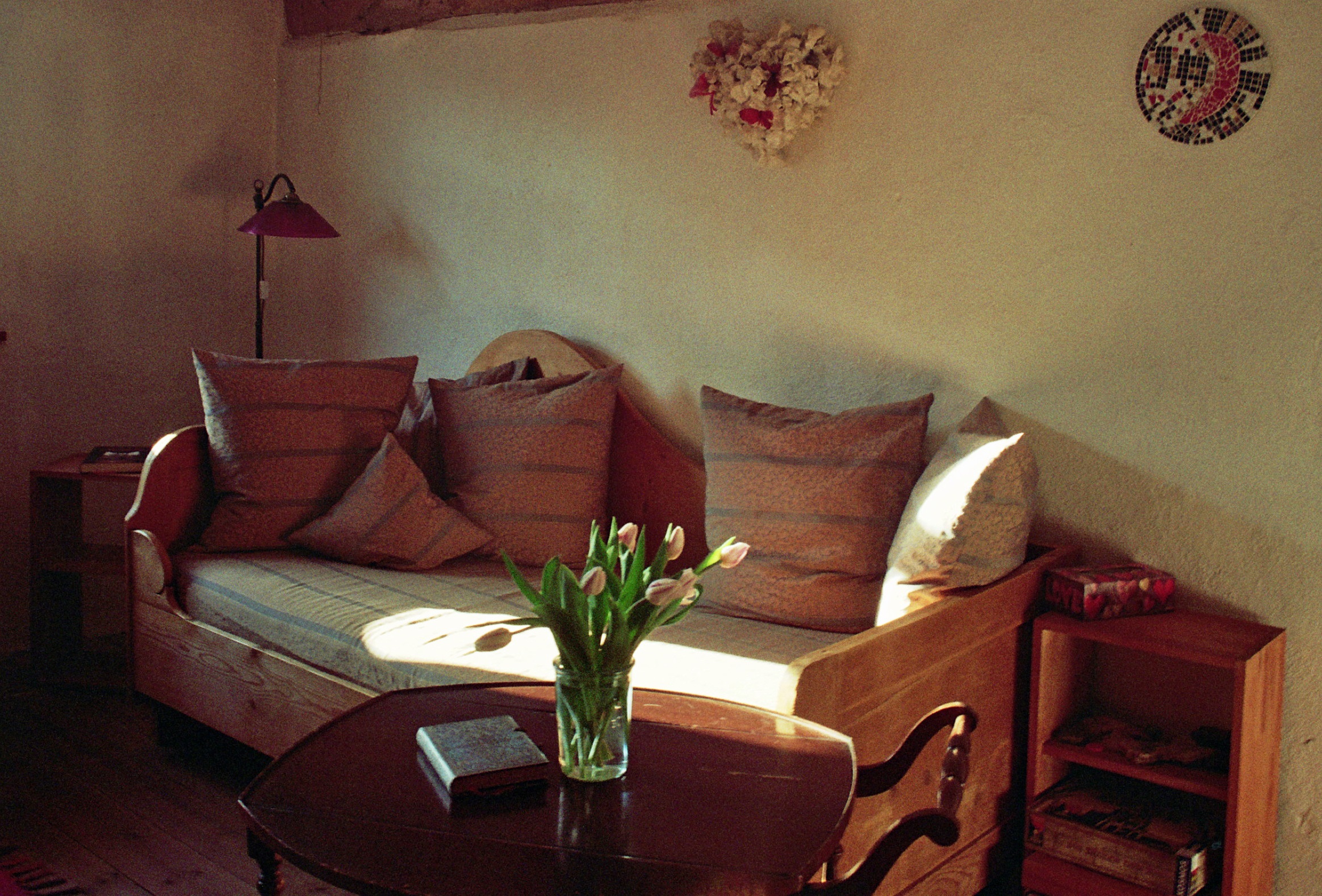 Recycling und Upcycling Im Haus sind außer den Matratzen kaum neue Dinge zu finden. Fast alles ist gebraucht oder selbst hergestellt - ob es nun das Sofa ist aus einem alten Bett, oder die Küche, oder alle Betten, die gebraucht gekauft, teils kunstvoll bemalt oder aus alten Teilen neu zusammen gebaut wurden. Sie werden außer für die Installationen kein Fitzelchen Kunststoff im ganzen Haus finden. Auch einige der Lampen wurden selbst gebaut. Die