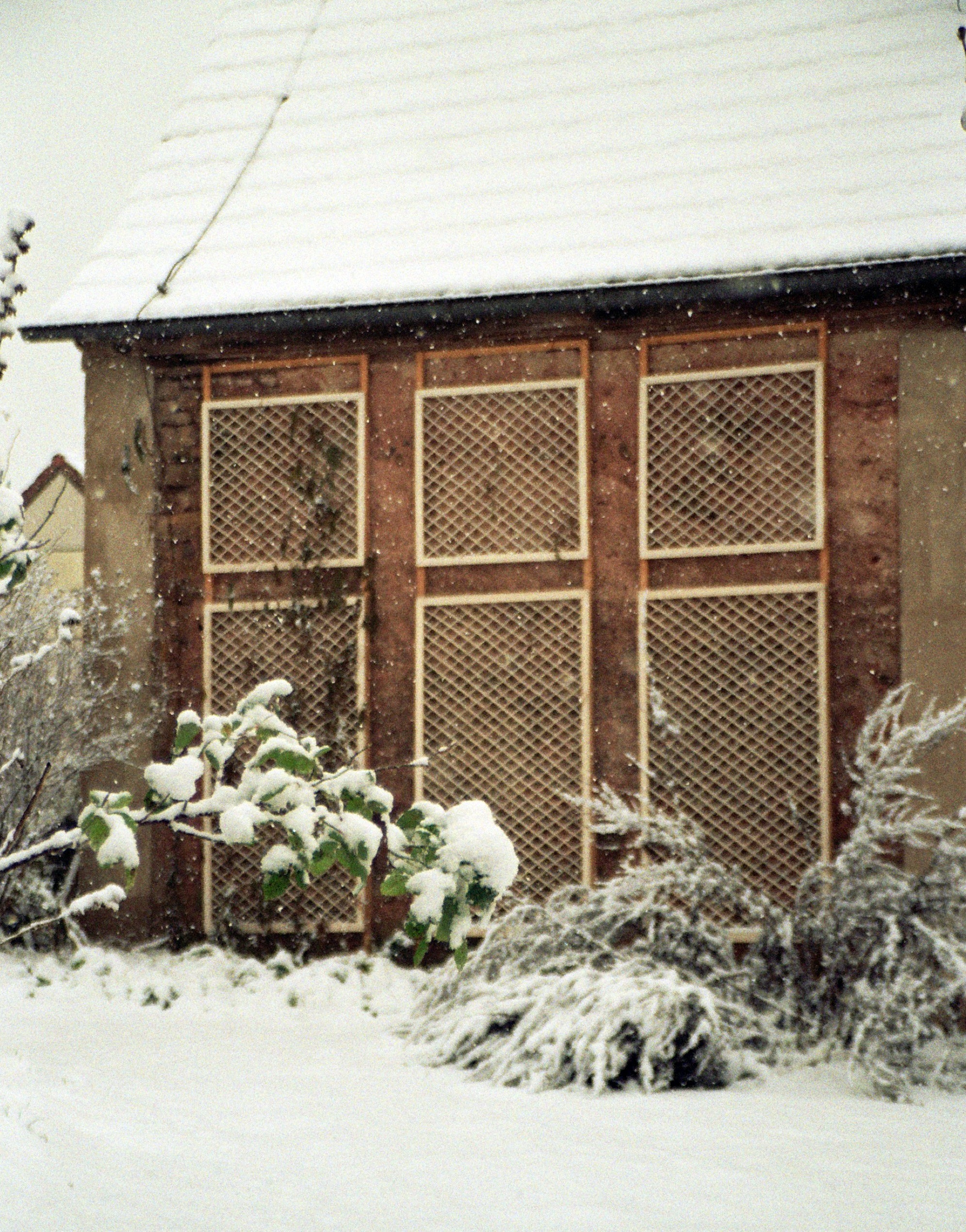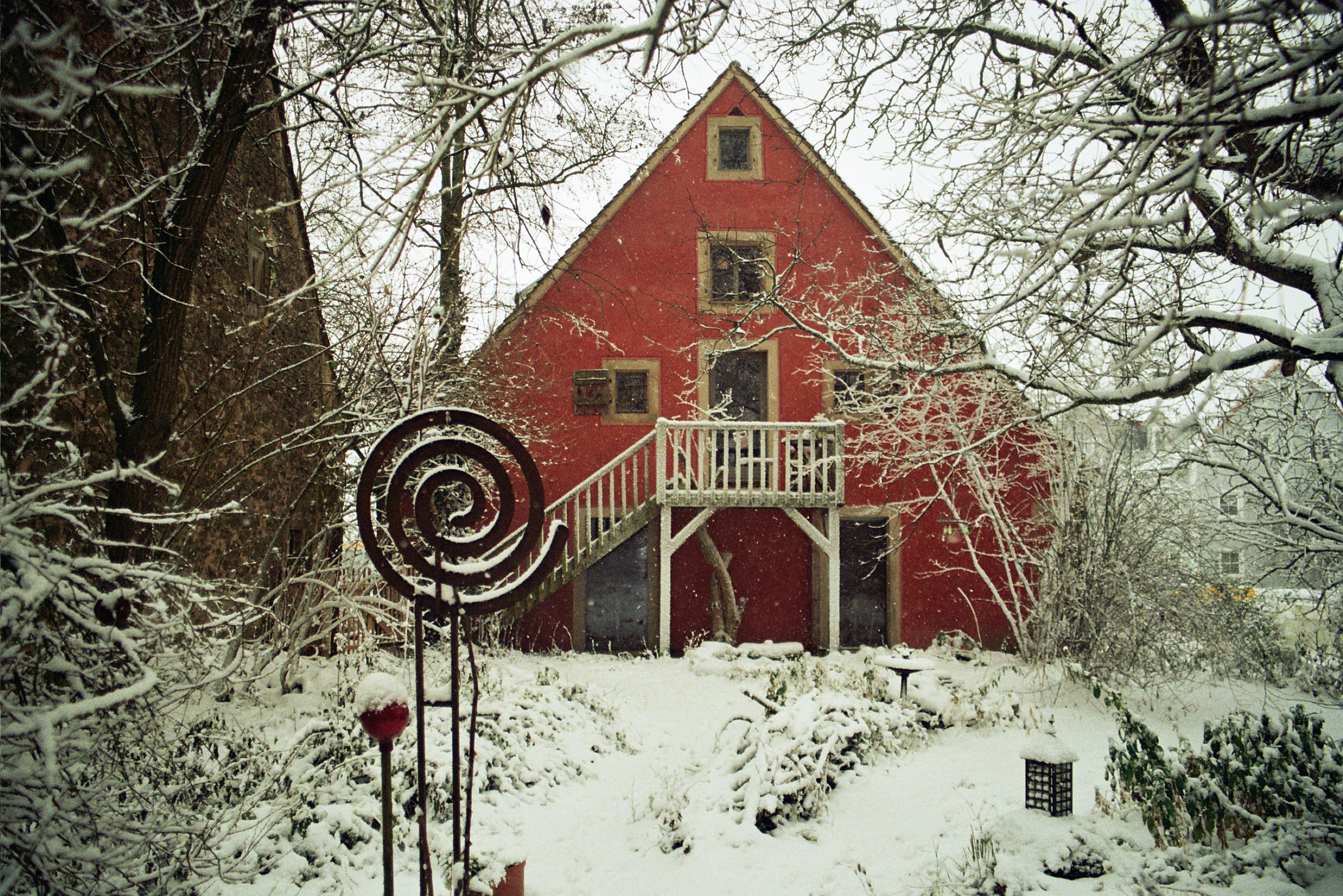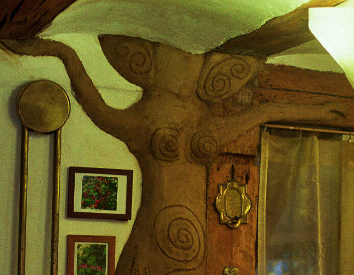 Die Lehmskulptur links, die ihre Hand schützend über den Eingang hält, verbirgt in ihrem warmen Bauch die Steigleitung der Heizung. Die