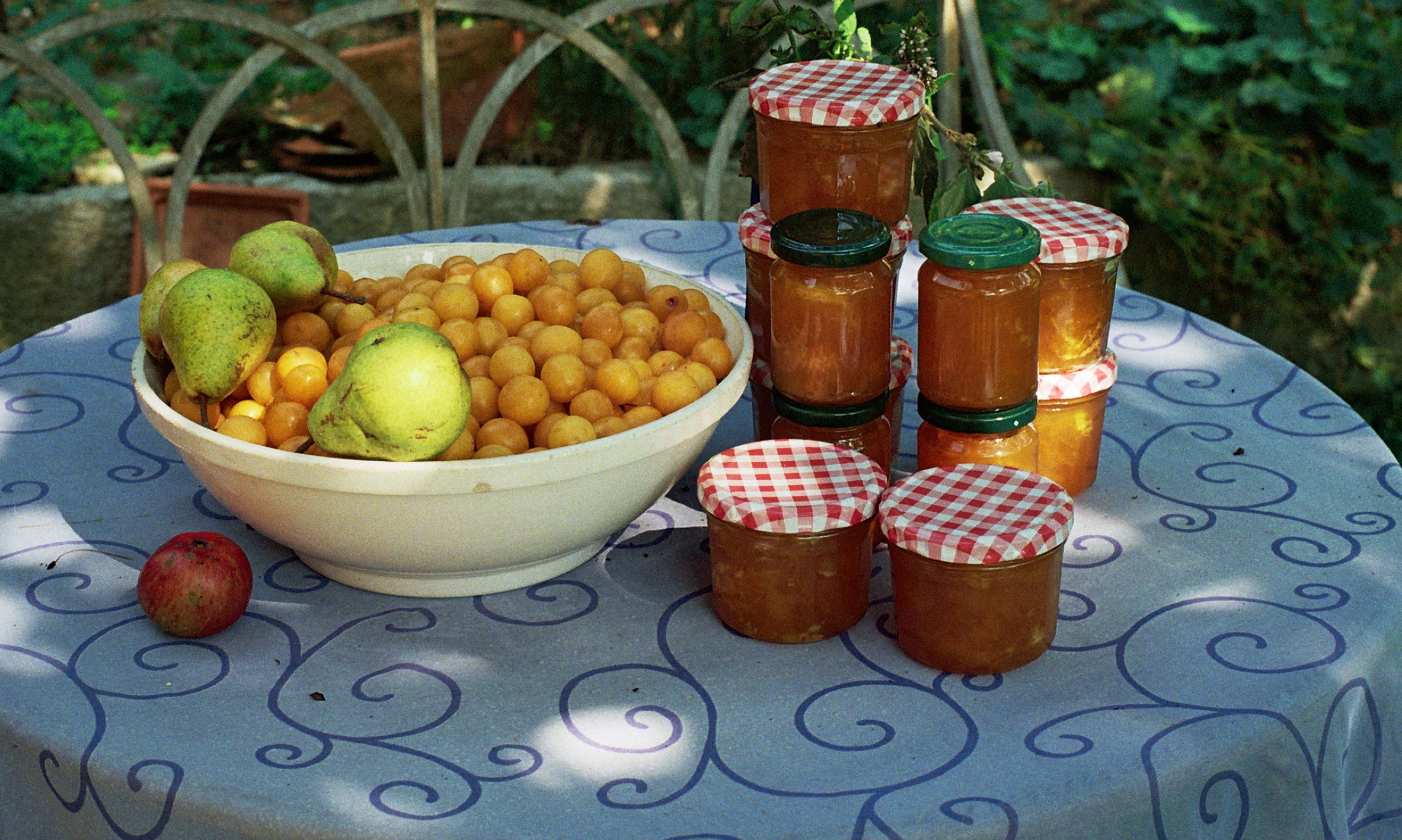 Obstbäume Im Garten stehen zwei Kirschbäume, sieben Apfelbäume, zwei Walnussbäume und fünf Myrobalanen, vulgo Zipperle oder Kirschpflaumen. (rechts die verschiedenen Früchte) Die Kirschpflaume ist eine wilde Art, aus ihnen wurden Zwetschgen und Mirabellen gezüchtet. Jeder Baum ist anders, wie auch seine Früchte. Die Bäume blühen sehr früh, noch vor den Schlehen, mit denen sie verwandt sind. Sie sind eine wertvolle Bienenweide und die Früchte sind angenehm süß-säuerlich, die Marmeladen schmecken sehr gut.